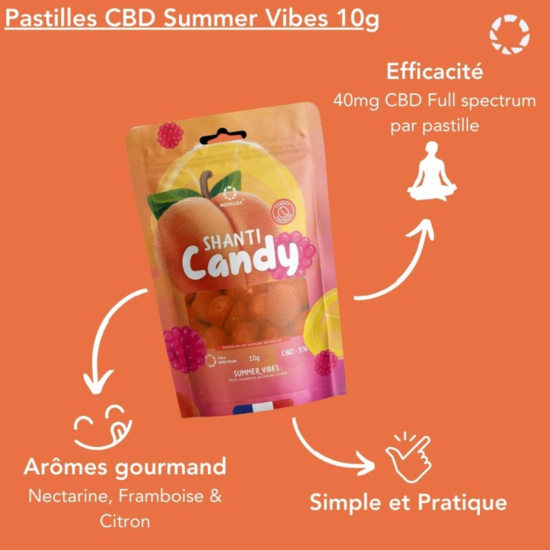 Savourez l'été avec les bonbons CBD Shanti Candy Summer Vibes de Novaloa, une création gourmande aux saveurs authentiques de pêche, framboise, nectarine et citron. Ces confiseries premium concentrées à 5% de CBD offrent une expérience relaxante unique.