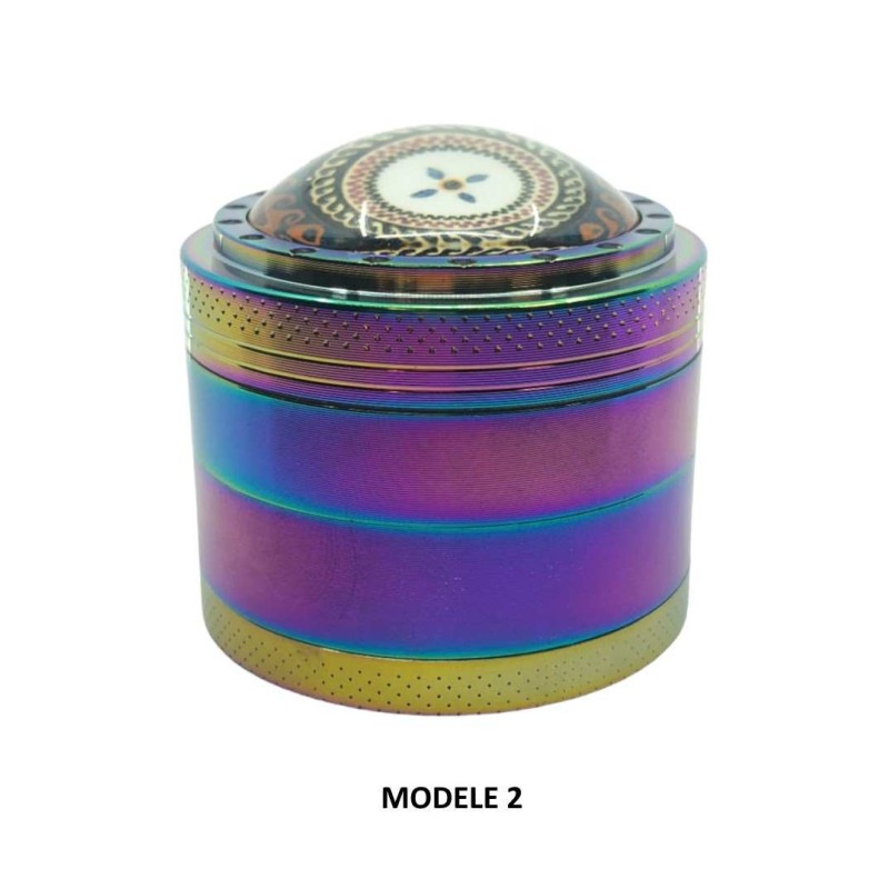 Chillax propose ce grinder arc-en-ciel en trois variations chromatiques soigneusement sélectionnées. Le Modèle 1 arbore des tons dorés et cuivrés subtils, parfait pour les utilisateurs recherchant une élégance discrète. Le Modèle 2 présente des nuances violettes et bleues intenses qui captent magnifiquement la lumière. Enfin, le Modèle 3 dévoile un spectre complet de couleurs flamboyantes pour les amateurs d'originalité.