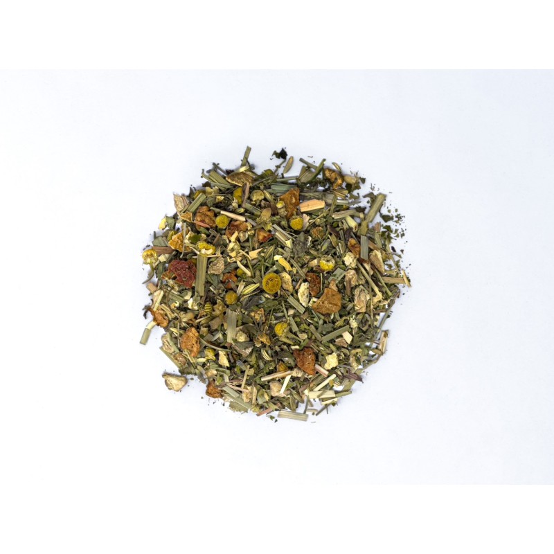 Le cœur de cette tisane repose sur un assemblage minutieux d'ingrédients biologiques aux propriétés complémentaires. Le gingembre apporte une note vivifiante, tandis que les morceaux de pomme offrent une douceur naturelle. Le fenouil et la citronnelle contribuent à l'équilibre digestif, pendant que les feuilles de menthe poivrée rafraîchissent délicatement le palais.