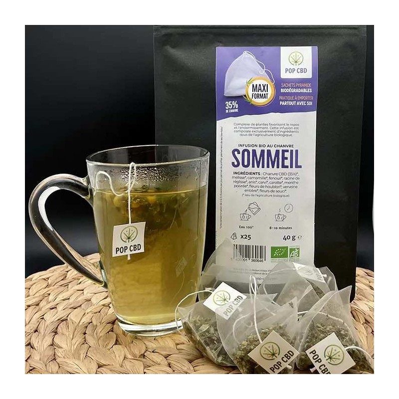 Plongez dans un sommeil paisible avec cette tisane CBD bio de la marque POP CBD. Composée de 35% de chanvre premium et enrichie de 11 plantes soigneusement sélectionnées, cette infusion naturelle favorise la détente et la relaxation. Chaque sachet pyramide libère tous les arômes et bienfaits des ingrédients biologiques pour une expérience apaisante unique.