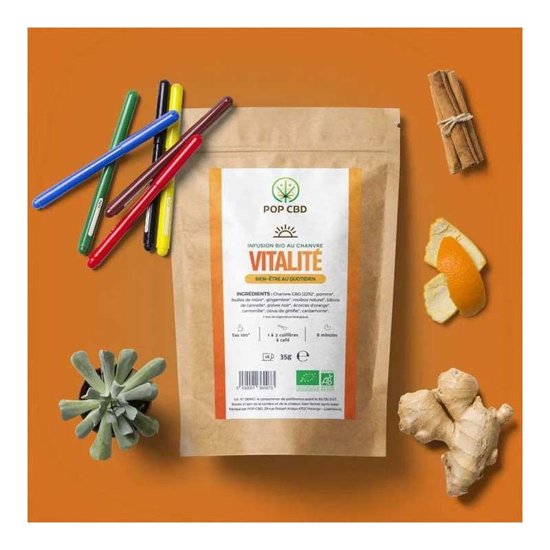 Retrouvez toute votre énergie naturellement avec cette infusion CBD bio Vitalité de POP CBD. Cette tisane énergisante sans théine combine harmonieusement du chanvre bio cultivé au Luxembourg avec des ingrédients soigneusement sélectionnés comme le gingembre stimulant, la cannelle réchauffante et les écorces d'orange tonifiantes.