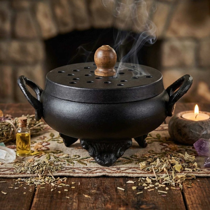 Ce magnifique brûleur d'encens chaudron en fonte noire allie tradition mystique et fonctionnalité moderne. Son design authentique avec couvercle perforé en bois noble et ses trois pieds sculptés apportent une dimension spirituelle unique à vos rituels. La fonte robuste assure une diffusion thermique optimale pour tous types d'encens.