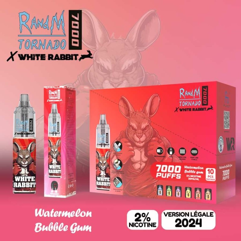 La Puff White Rabbit Tornado 7000 marque une nouvelle ère dans l'univers des cigarettes électroniques jetables rechargeables. Cette création révolutionnaire associe le design iconique de White Rabbit à la technologie RandM pour offrir une expérience de vapotage exceptionnelle. Son profil gustatif Watermelon Bubble Gum transporte instantanément vers l'enfance avec ses notes de pastèque juteuse et de chewing-gum sucré.