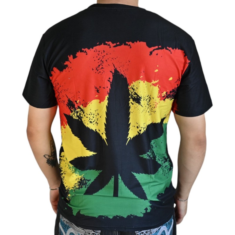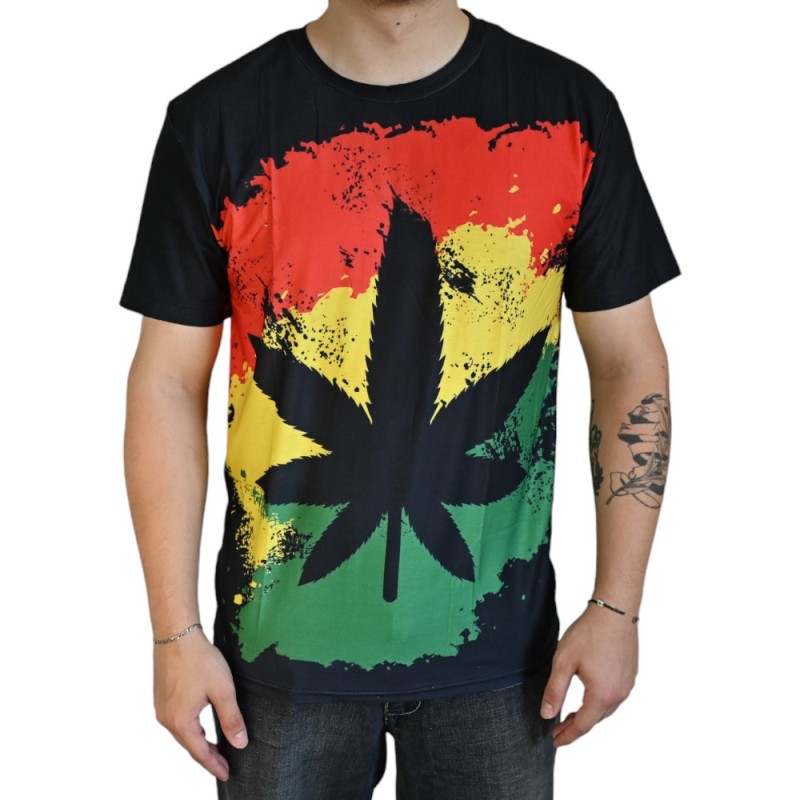 Exprimez votre passion pour l'univers du cannabis avec ce t-shirt au design rasta saisissant. La silhouette noire de la feuille emblématique se détache magnifiquement sur un fond aux couleurs vives rouge, jaune et vert, créant un effet visuel spectaculaire.