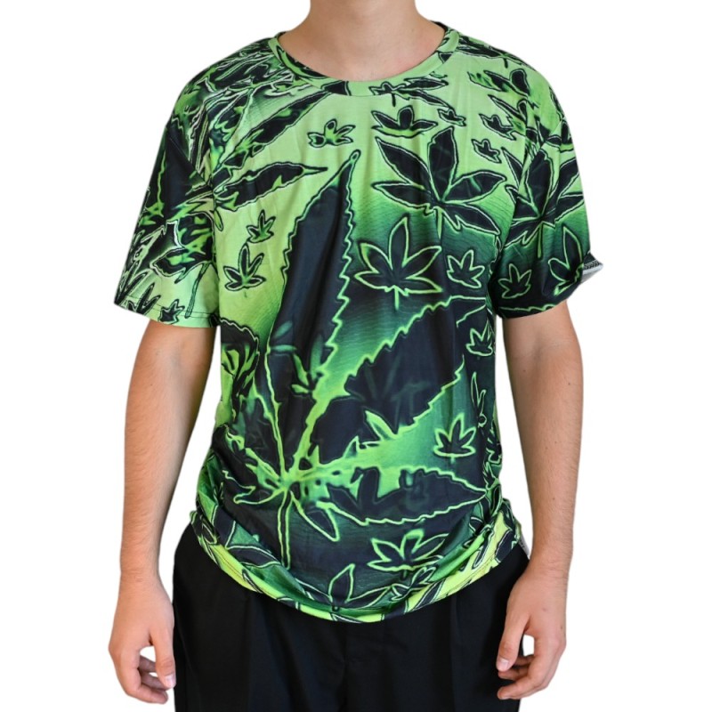 Ce T-shirt Cannabis Psychédélique Vert offre un design captivant avec des motifs de feuilles cannabis dans des tons verts éclatants. Confectionné en tissu technique respirant (95% polyester, 5% spandex), il garantit un confort optimal et une liberté de mouvement incomparable.