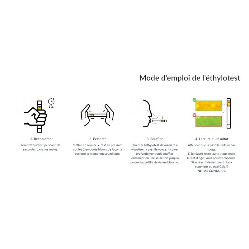 Chaque unité comprend un test réactif accompagné d'une notice détaillée expliquant précisément la procédure d'utilisation. Cette documentation complète permet une prise en main immédiate du dispositif, même pour les utilisateurs novices en matière de tests d'alcoolémie.